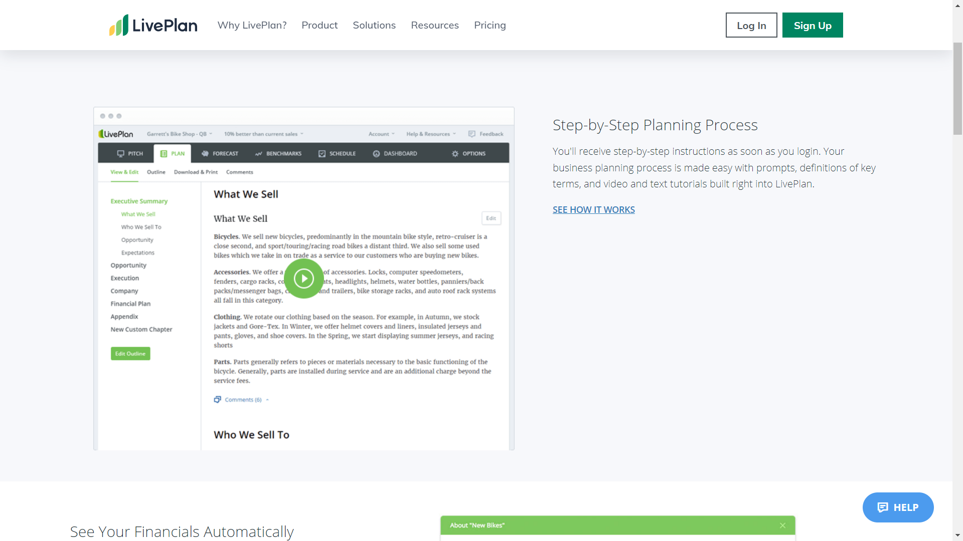 The only thing between an almost-readymade business plan and the business owner is signing up for LivePlan. Once that is done, this online business plan guides you through a structured process for creating the plan, including a comprehensive planning process that covers creating financial forecasts, and making professional-looking shareable plans.