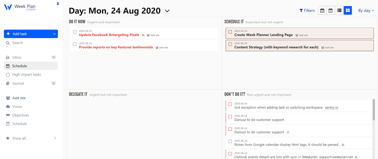 A day planner app helps you prioritize your daily tasks so that you don’t fall victim to the urgency trap. WeekPlan, as a digital peaks day planner, uses the Eisenhower matrix to help you focus on practical, not just productive, tasks. It also facilitates better task completion. The day planner’s quadrant view is designed to help you and your team achieve long-term gains instead of short-term ones. With WeekPlan’s day planner app, you can automate your work life so that you and your team can work less and do more as your energy rises naturally through the day.