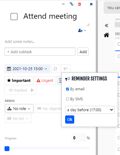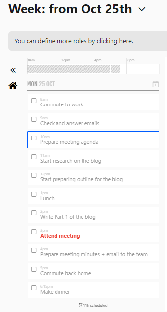 Once you block an activity, whether it is for the same day or the day after (if you are planning your week in advance, which we highly recommend!), you can, at the same time, set a reminder. You have the option to remind yourself a day before or one hour before the task is due, either via email or text message. Choose what is convenient and ace your work duties by always being prepared.