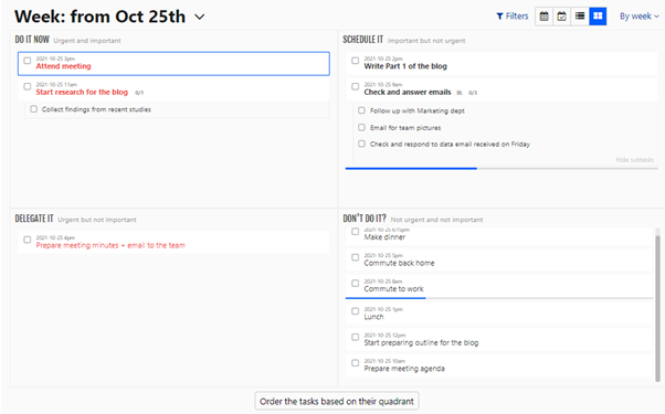 How can you manage your task per their priority? Simply use Week Plan’s integrated tool that sorts out all your daily activities into four quadrants. Follow a simple method and use Week Plan to label each task as either important, urgent, both, or neither. Then click the button visible on the dashboard: ‘Order the tasks based on their quadrant.’ Once you do that, the app will automatically sort out your tasks per the standard described by time management guru Steven Covey: