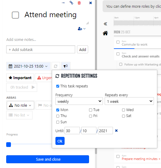 The tool has a repetition settings feature, using which you can modify a task that is recurring. Select the frequency of the activity (daily, weekly, monthly, yearly) and set how soon the task would repeat itself (anywhere between 1-29 days, weeks, months, or years). You can also set a final deadline - that is, the date until when the task will continue to take place. So, for instance, you might have a marketing meeting scheduled once a week for four months until the quarter is over. You can use Week Plan to schedule and time block for it in one simple go.