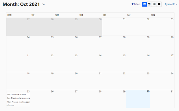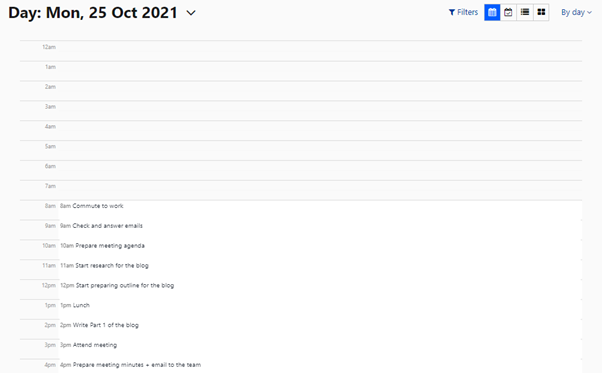 The calendar view will help you visualize your day, week, or month and enable you to make changes as needed. You can also see the blank spots in your calendar and fill them up with activities that you have not scheduled yet - such as your personal growth time or your social hangout time.