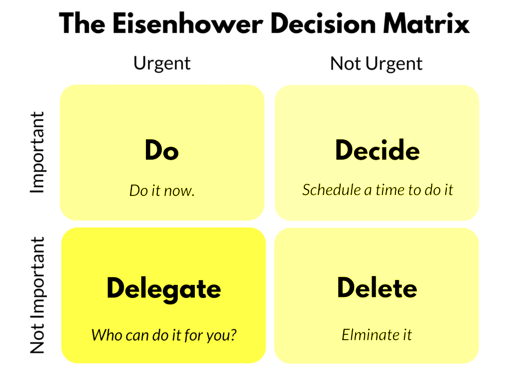 The Eisenhower Matrix is a simple but powerful tool to identify your priorities. Also known as the Urgent-Important Matrix, it helps you sort through the piles of work you have and put them on your to-do list based solely on their priority level.