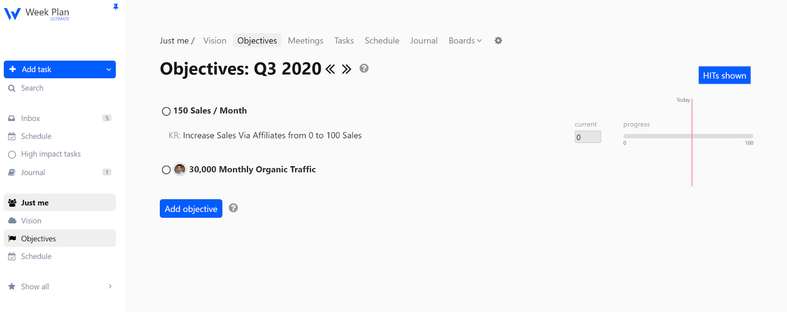 HITs are a list of high impact tasks that you plan on achieving for a week. They usually come from the top items in your Backlog but can also come directly from the Inbox. HITs help you progress on each of your objectives or role vision. The HITs can be grouped either by roles or by objectives.
